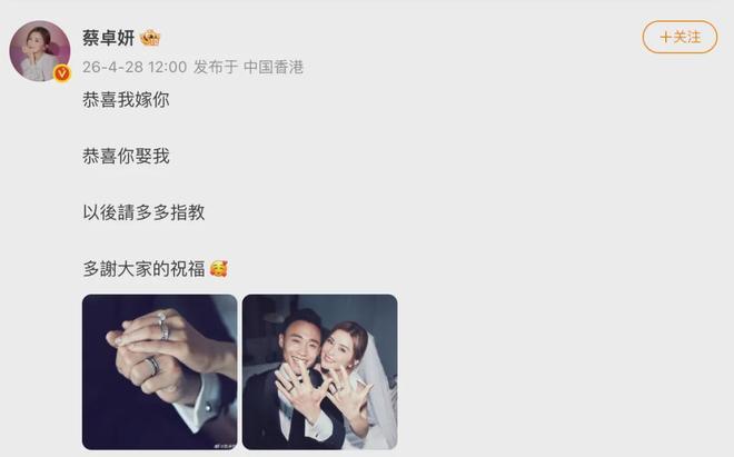 刚刚(28日),知名女歌手蔡卓妍(阿Sa)发微博宣布结婚:恭喜我嫁你,恭喜你娶我,以后请多多指教,多谢大家的祝福。